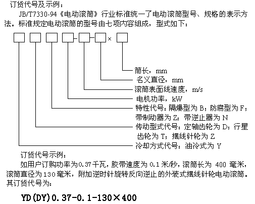 (2).用戶(hù)訂購(gòu)逆止電動(dòng)滾筒時(shí),須注明旋轉(zhuǎn)方向,如不注明則為任意方向。其表示方法為在特性代號(hào)后加“S”(表示在電機(jī)引出線(xiàn)一側(cè)觀察,端蓋應(yīng)順時(shí)針旋轉(zhuǎn))或“N”(表示在電機(jī)引出線(xiàn)一側(cè)觀察,端蓋應(yīng)逆時(shí)針旋轉(zhuǎn))。
