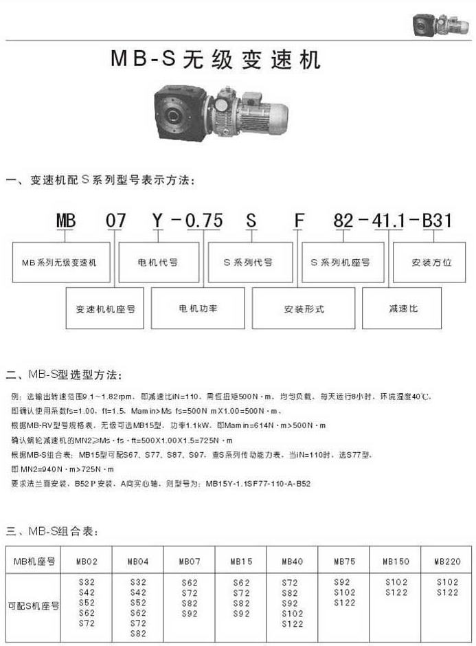 MB-S無級(jí)變速機(jī)型號(hào)表示法選型方法MB-S組合表