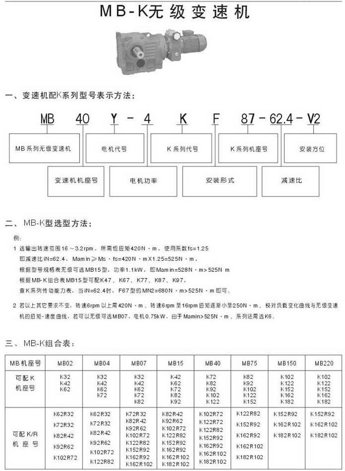 MB-K無級變速機(jī)型號表示法選型方法MB-K組合表